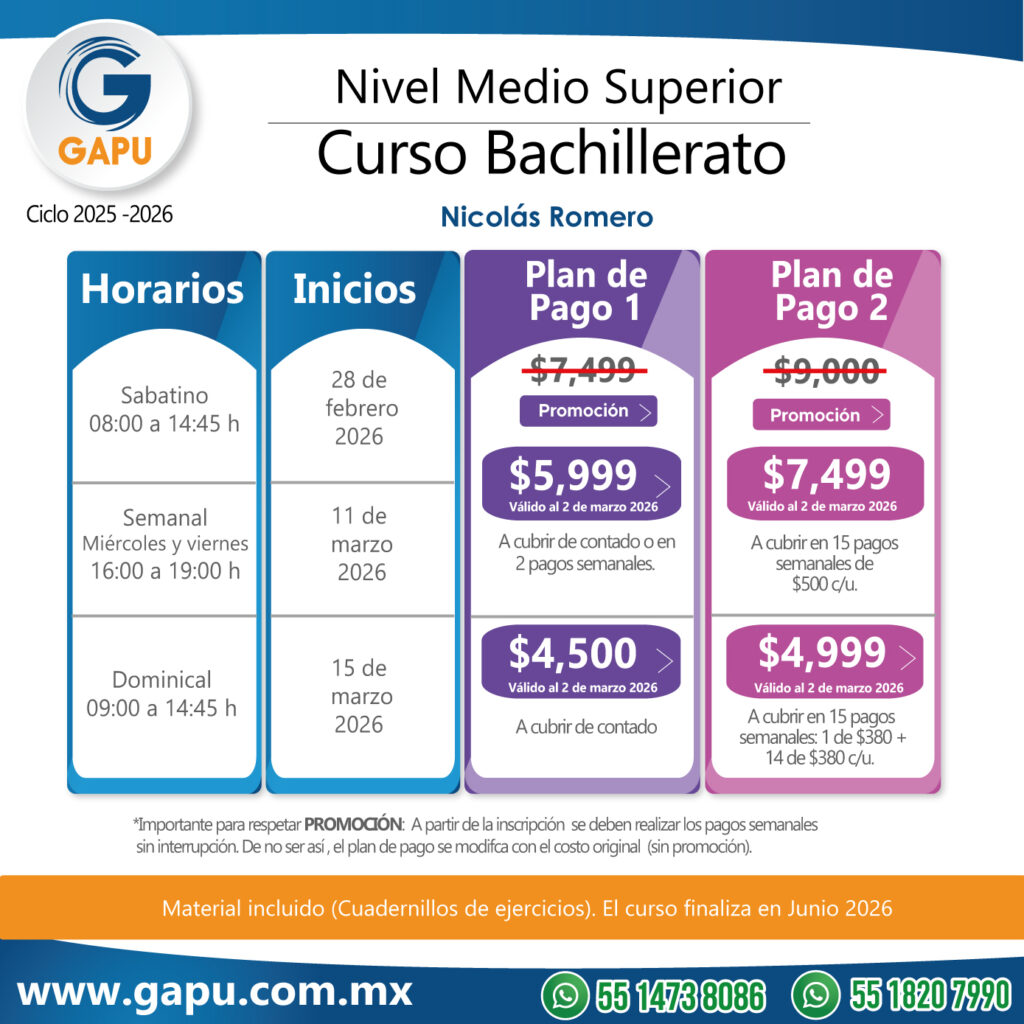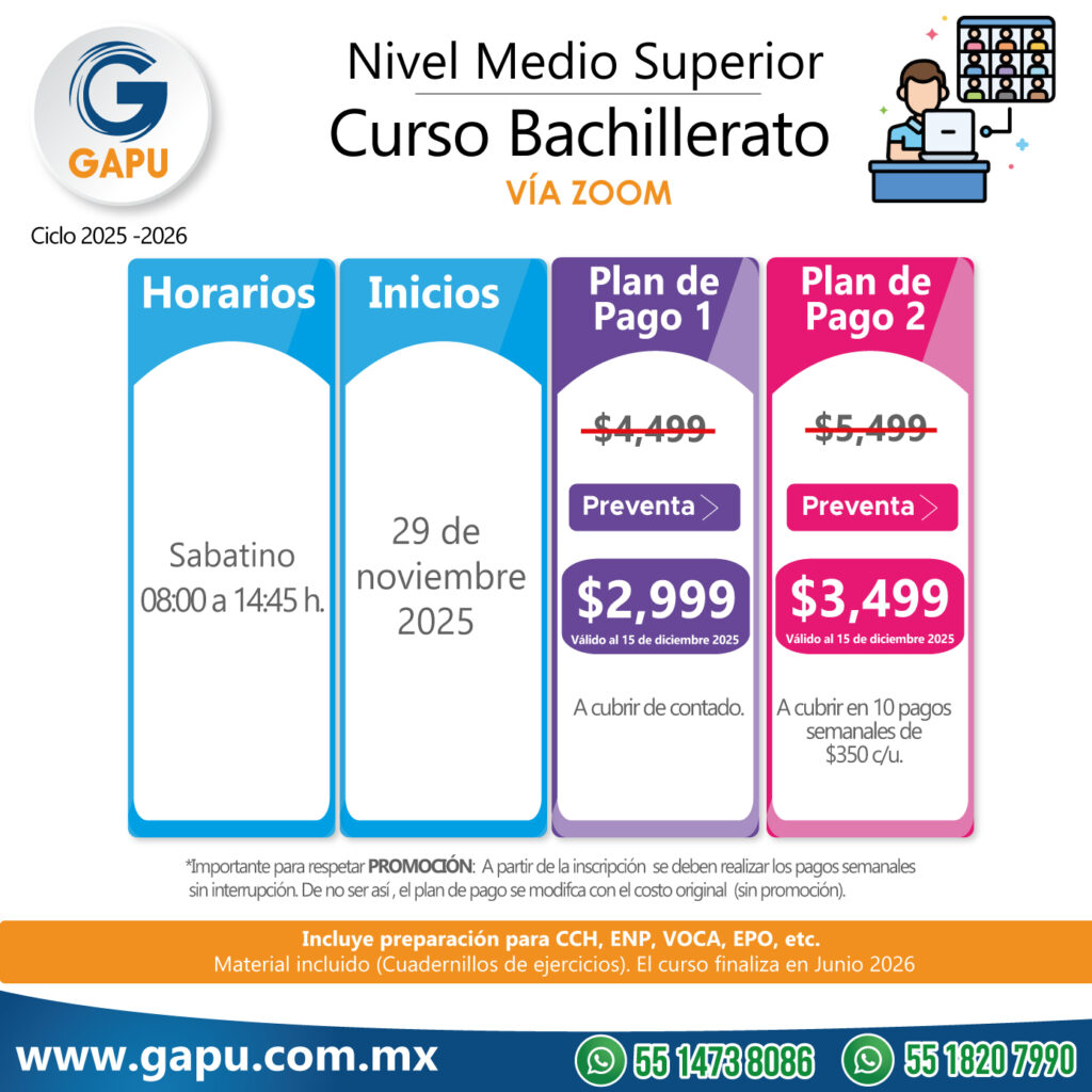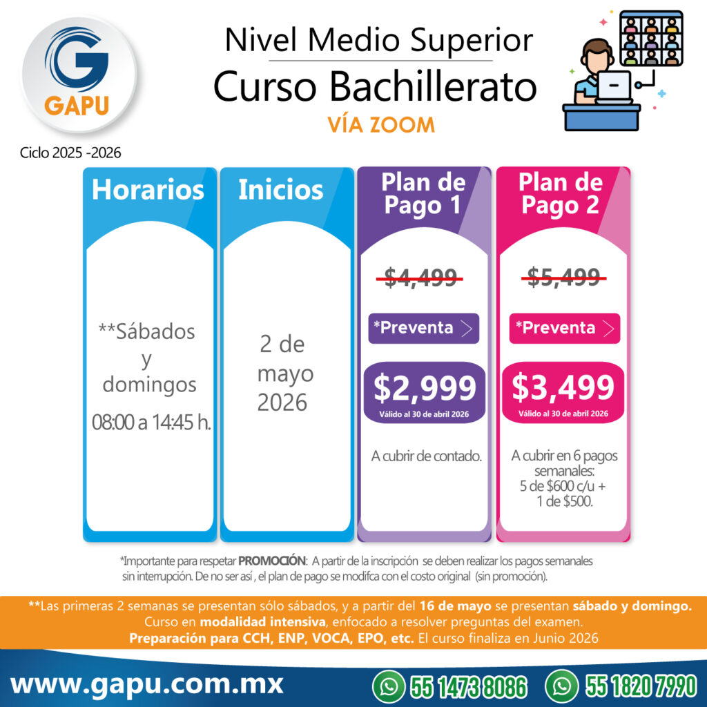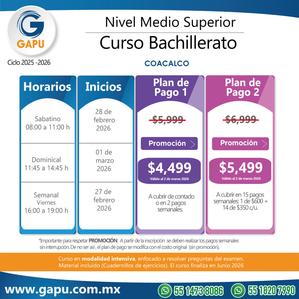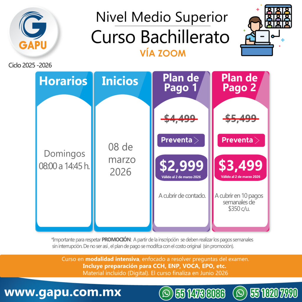 Ingresa a tu primera opción de preparatoria con el curso que tenemos para ti. Nuestras clases están diseñadas para que logres obtener más de 100 aciertos. De esta forma lograrás ingresar a escuelas de alta demanda: CCH, ENP (UNAM), Voca (Poli), Normales, Preparatorias Oficiales, etc.